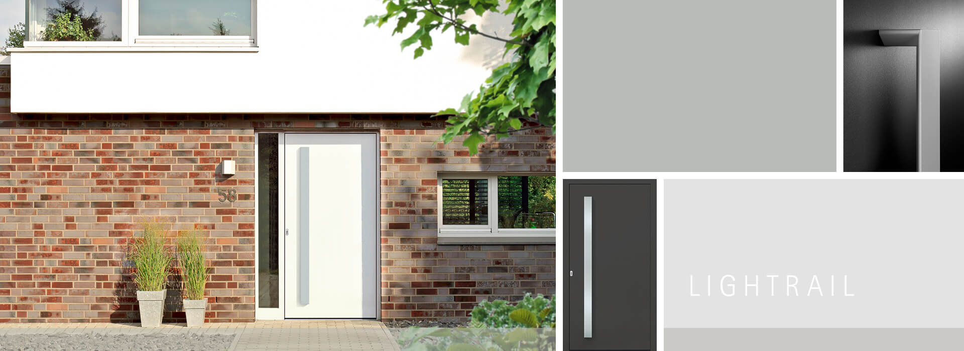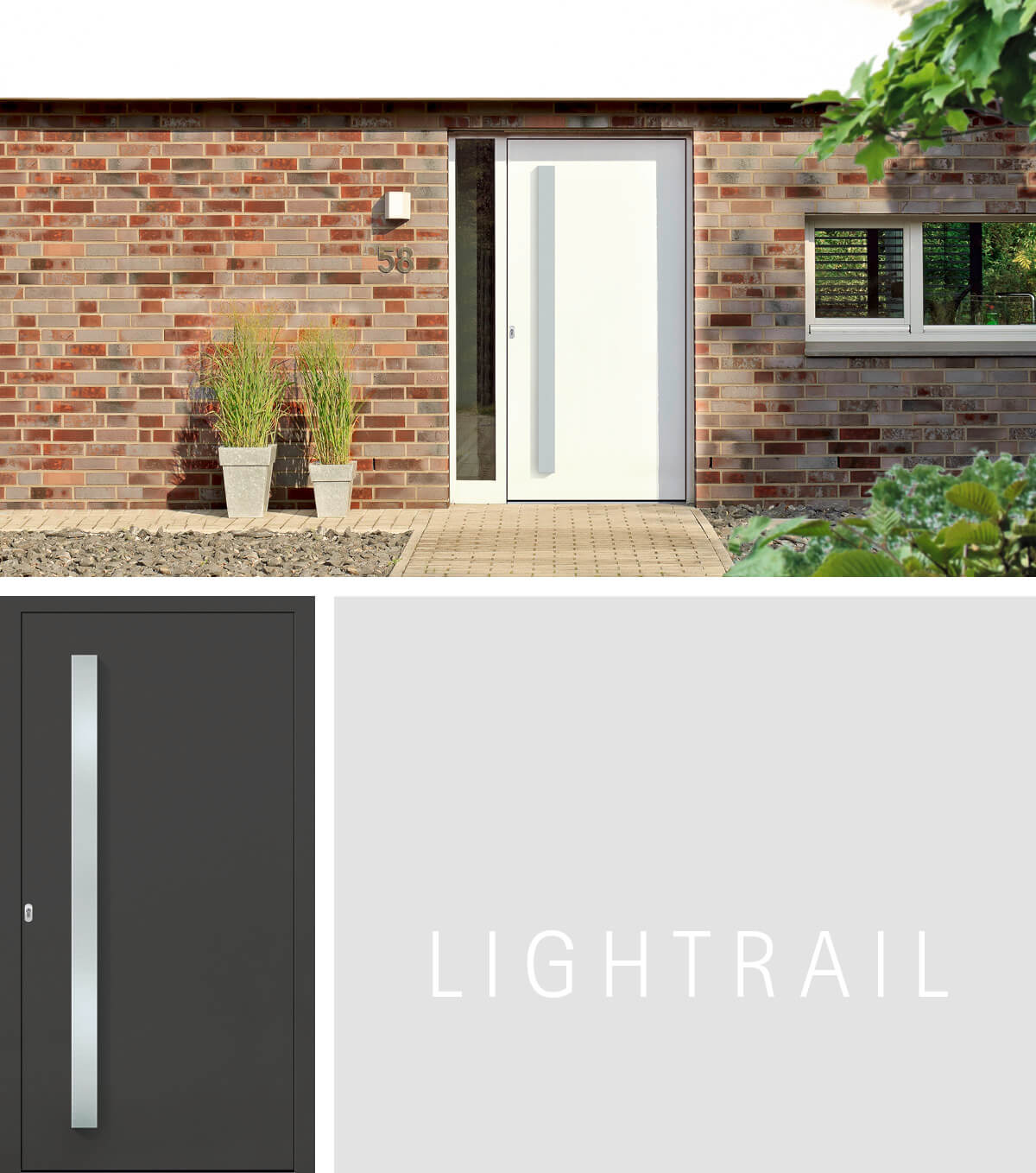 Haustürgriff, Bauform und Farbgebung bestimmen hier allein die optische Wirkung der Haustürfüllung. Diese Lösung bietet sich auch für mehrteilige Portale und Überhöhen an. Das Auge des Betrachters wird durch nichts abgelenkt und konzentriert sich nur auf den Haustürflügel mit Griff. Er ist funktional und ergonomisch geformt. Verglaste Seitenteile lassen Licht und Helligkeit in den Flur. Auch die Sicherheit kommt nicht zu kurz. Geschlossene beidseitige Aufsatzfüllungen bieten maximalen Schutz gegen Einbruch dank einer äußeren 3 mm und inneren 2 mm starken Aluminiumdeckschicht.