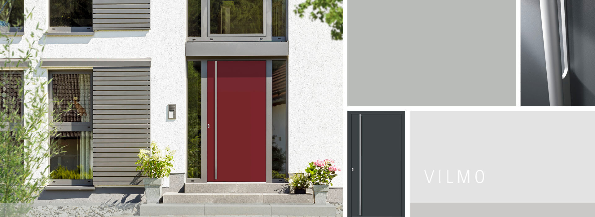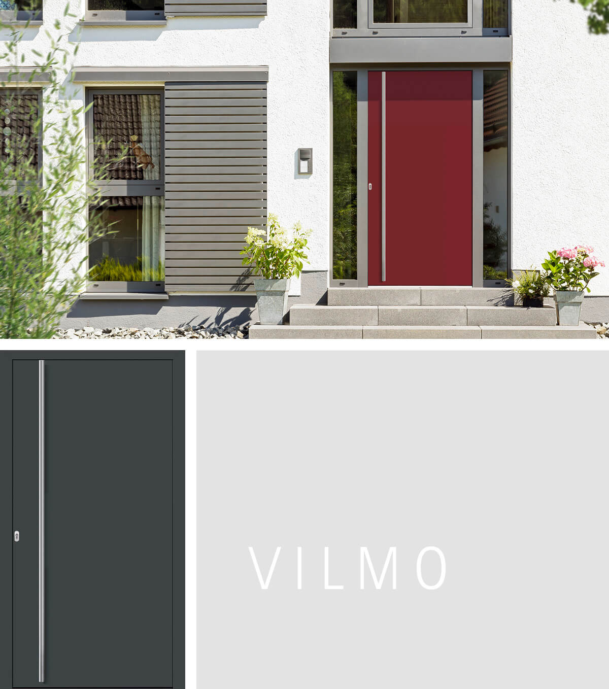 Haustürgriff, Bauform und Farbgebung bestimmen hier allein die optische Wirkung der Haustürfüllung. Diese Lösung bietet sich auch für mehrteilige Portale und Überhöhen an. Das Auge des Betrachters wird durch nichts abgelenkt und konzentriert sich nur auf den Haustürflügel mit Griff. Er ist funktional und ergonomisch geformt. Verglaste Seitenteile lassen Licht und Helligkeit in den Flur. Auch die Sicherheit kommt nicht zu kurz. Geschlossene beidseitige Aufsatzfüllungen bieten maximalen Schutz gegen Einbruch dank einer äußeren 3 mm und inneren 2 mm starken Aluminiumdeckschicht.