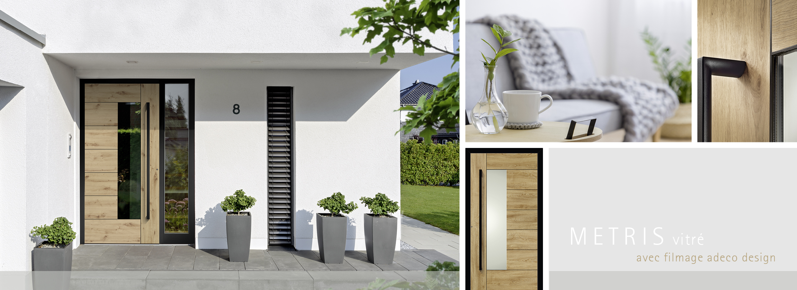 Aimez-vous le confort? Combinez ensuite des détails noirs avec une finition en bois naturel. Les films design adeco sont très similaires au bois véritable en termes d'aspect et de toucher et donnent à l'entrée une impression accueillante et confortable.Choisissez parmi quatre tons bois chaleureux – malt, nature, béton et alpin.  Avec les modèles Metris vitrés, Metris fermés, Alliso et Caverro, il est possible de combiner des films verticaux  et horizontaux. Ici, le veinage suit le design de la porte, par exemple avec les applications horizontales.