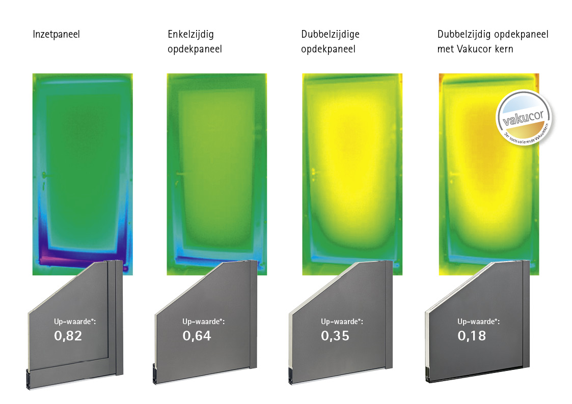 * Vergelijkende Up-waarden van het paneel over 900 x 2000 mm berekend. De werkelijke Up-waarde van het voordeurpaneel hangt af van het gekozen model, de materialen en de afmetingen, welke resulteren uit de inbouwsituatie. De Ud-waarde van de voordeur als geheel hangt af van het gebruikte profielsysteem, de gebruikte voordeurdrempel en de afmetingen. Neem hiervoor contact op met uw vakhandel.