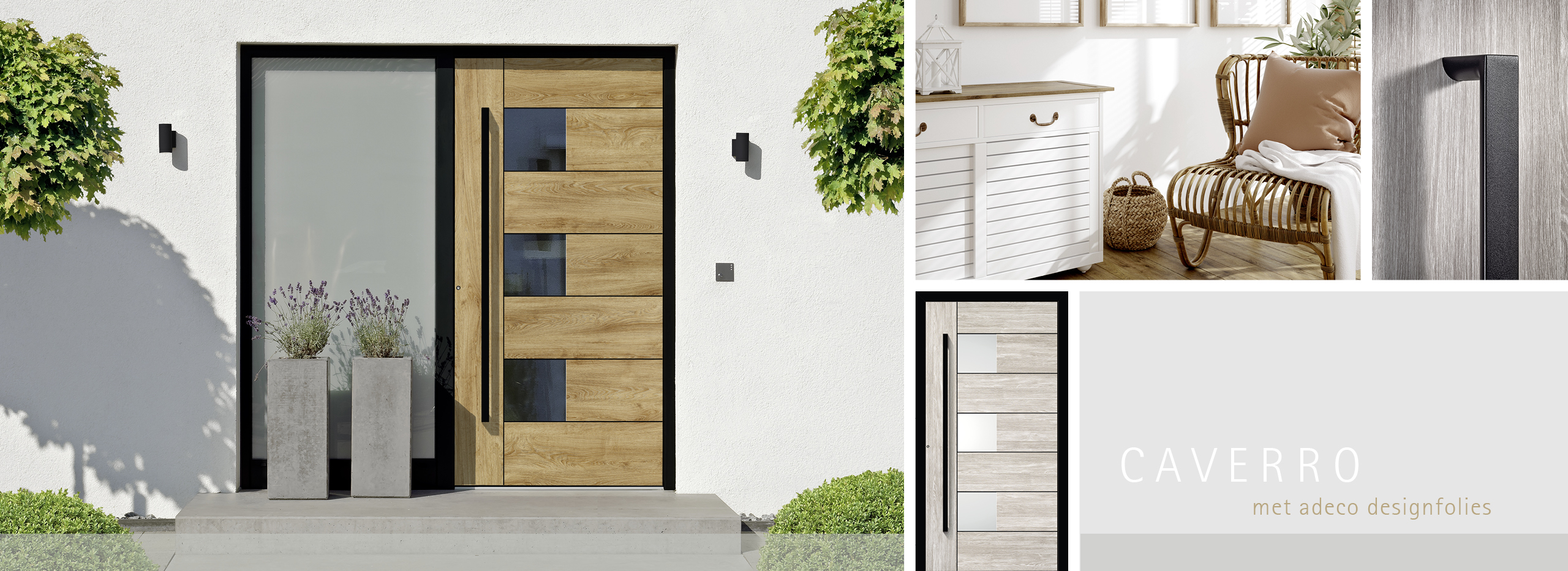Houdt u van gezellig? Combineer dan zwarte details met een decor van natuurlijk hout. De adeco designfolies evenaren een houten uiterlijk en gevoel en geven de entree een uitnodigende, warme indruk. Kies uit vier huiselijke houttinten: malt, natuur, beton en alpine. Bij de modellen Metris beglaasd, Metris gesloten, Alliso en Caverro, is het mogelijk om de oriëntatie van de folie te combineren (adeco design foiling aD). Hierbij volgt de nerf het ontwerp van de deur, bijvoorbeeld het horizontale inlegwerk.