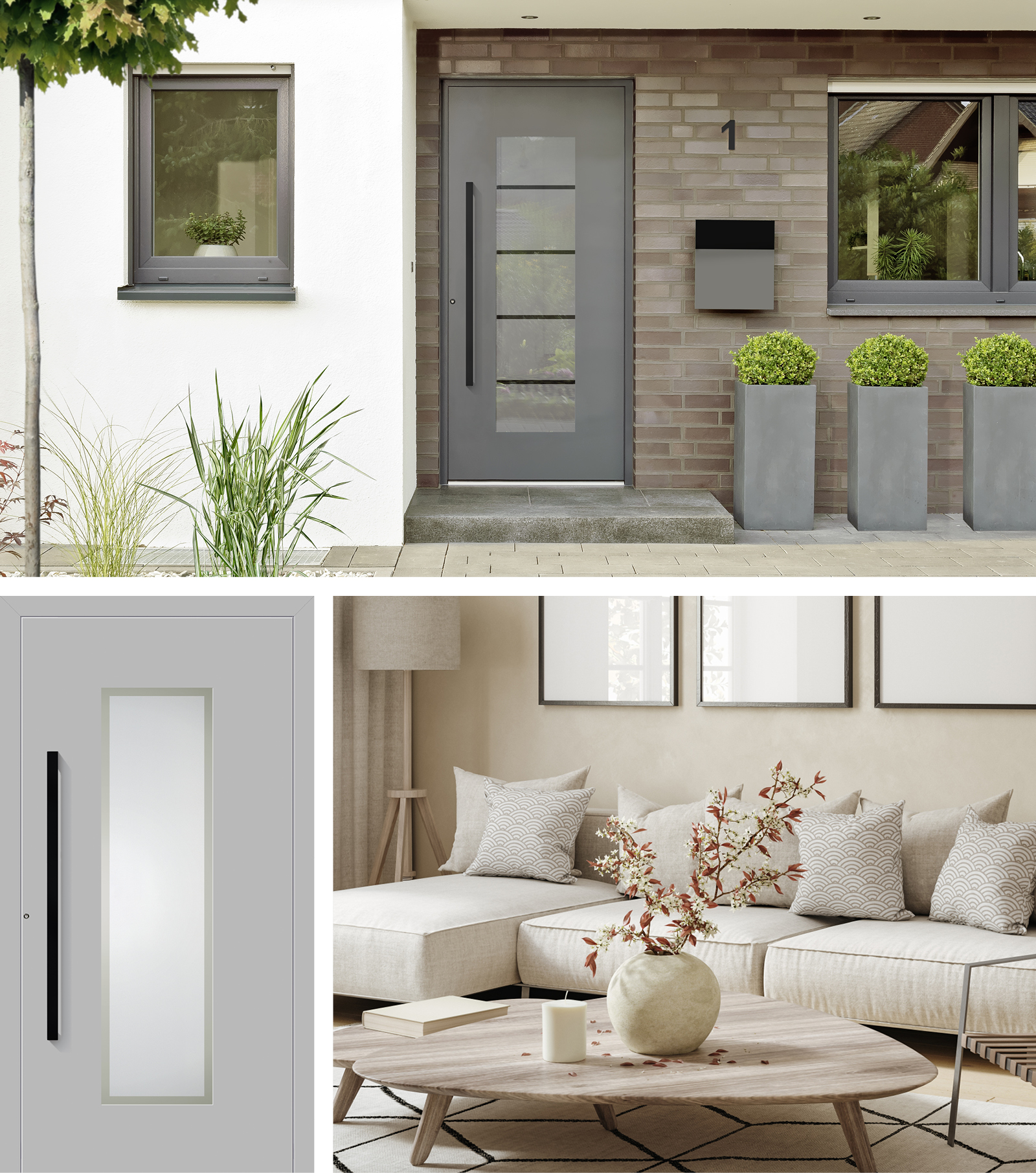 Schwarz als Gestaltungselement ist in der Möbelbranche schon länger im Trend. Aber auch Haustüren gibt die Farbe Schwarz einen neu entdeckten, ganz besonderen Eindruck. Sicher, eine weiße Tür passt zu fast allen Häusern, doch dunkle Töne verleihen mehr Tiefe und neue Gestaltungsmöglichkeiten. Wer es Ton in Ton mag, kombiniert zu den schwarzen Griffen und Applikationen auch den Briefkasten, die Hausnummer oder die Lampen in Schwarz. Und sogar die komplette Tür ist in Schwarz ein echter Hingucker. Haben Sie es gern modern, wählen Sie eine zeitlose Grundfarbe oder eine der trendigen  Designfolien in Rost- oder Betonoptik. Jedes einzelne Türmodell lässt sich so in reichlichen Kombinationsmöglichkeiten individuell gestalten und gibt Ihrem Haus seinen eigenen Charme.
