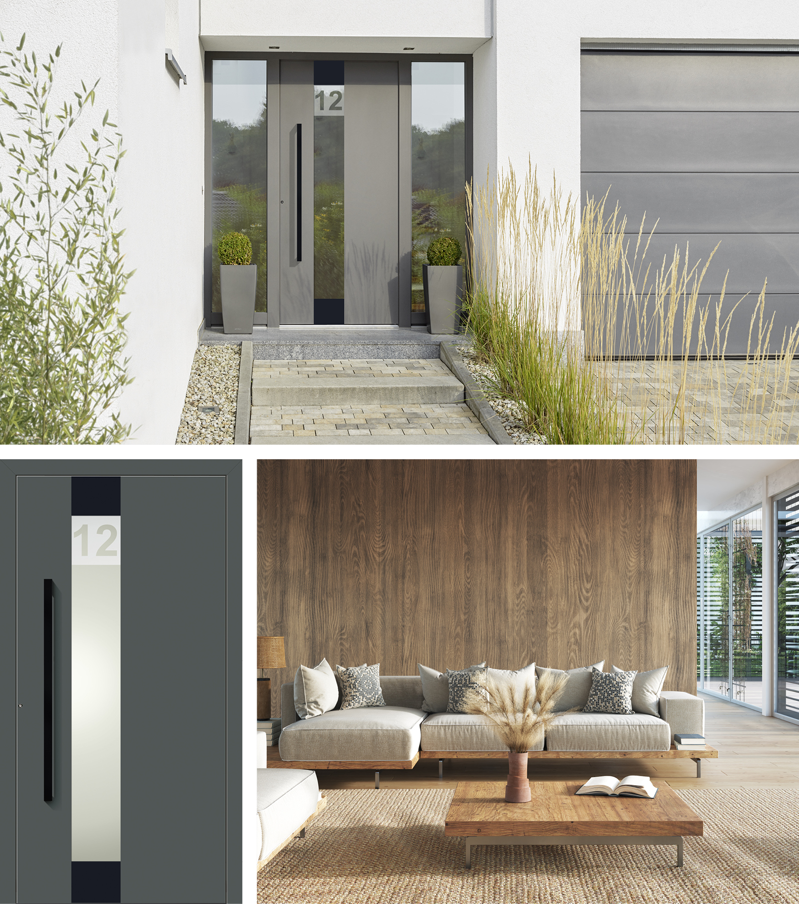 Schwarz als Gestaltungselement ist in der Möbelbranche schon länger im Trend. Aber auch Haustüren gibt die Farbe Schwarz einen neu entdeckten, ganz besonderen Eindruck. Sicher, eine weiße Tür passt zu fast allen Häusern, doch dunkle Töne verleihen mehr Tiefe und neue Gestaltungsmöglichkeiten. Wer es Ton in Ton mag, kombiniert zu den schwarzen Griffen und Applikationen auch den Briefkasten, die Hausnummer oder die Lampen in Schwarz. Und sogar die komplette Tür ist in Schwarz ein echter Hingucker. Haben Sie es gern modern, wählen Sie eine zeitlose Grundfarbe oder eine der trendigen  Designfolien in Rost- oder Betonoptik. Jedes einzelne Türmodell lässt sich so in reichlichen Kombinationsmöglichkeiten individuell gestalten und gibt Ihrem Haus seinen eigenen Charme.