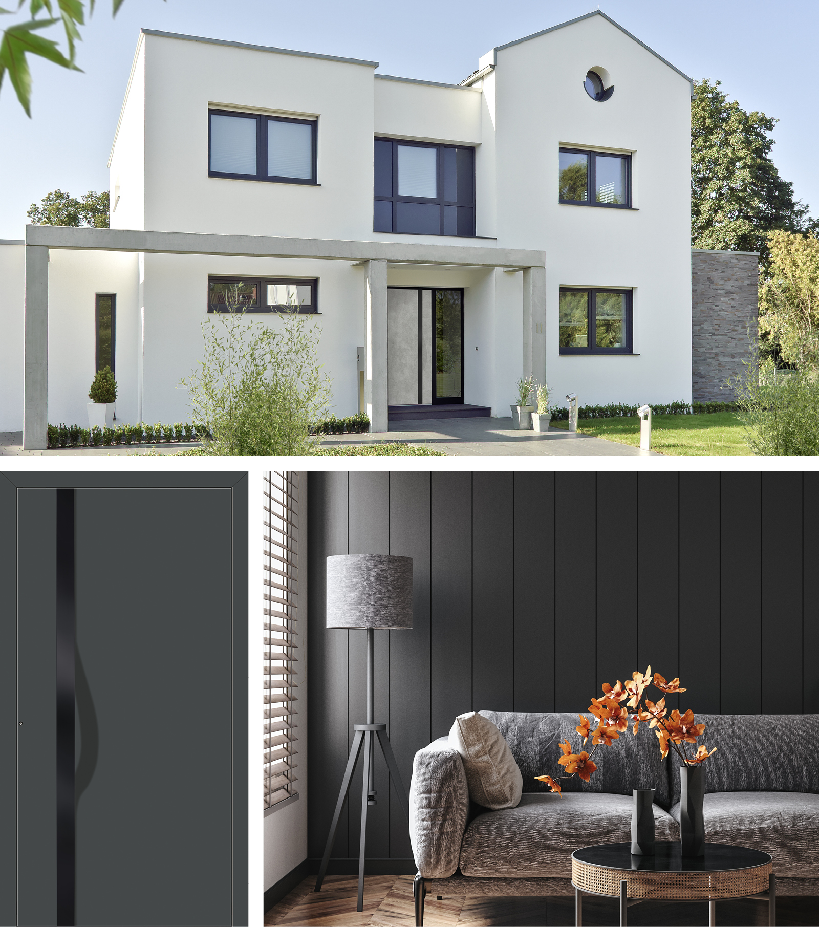 Schwarz als Gestaltungselement ist in der Möbelbranche schon länger im Trend. Aber auch Haustüren gibt die Farbe Schwarz einen neu entdeckten, ganz besonderen Eindruck. Sicher, eine weiße Tür passt zu fast allen Häusern, doch dunkle Töne verleihen mehr Tiefe und neue Gestaltungsmöglichkeiten. Wer es Ton in Ton mag, kombiniert zu den schwarzen Griffen und Applikationen auch den Briefkasten, die Hausnummer oder die Lampen in Schwarz. Und sogar die komplette Tür ist in Schwarz ein echter Hingucker. Haben Sie es gern modern, wählen Sie eine zeitlose Grundfarbe oder eine der trendigen  Designfolien in Rost- oder Betonoptik. Jedes einzelne Türmodell lässt sich so in reichlichen Kombinationsmöglichkeiten individuell gestalten und gibt Ihrem Haus seinen eigenen Charme.