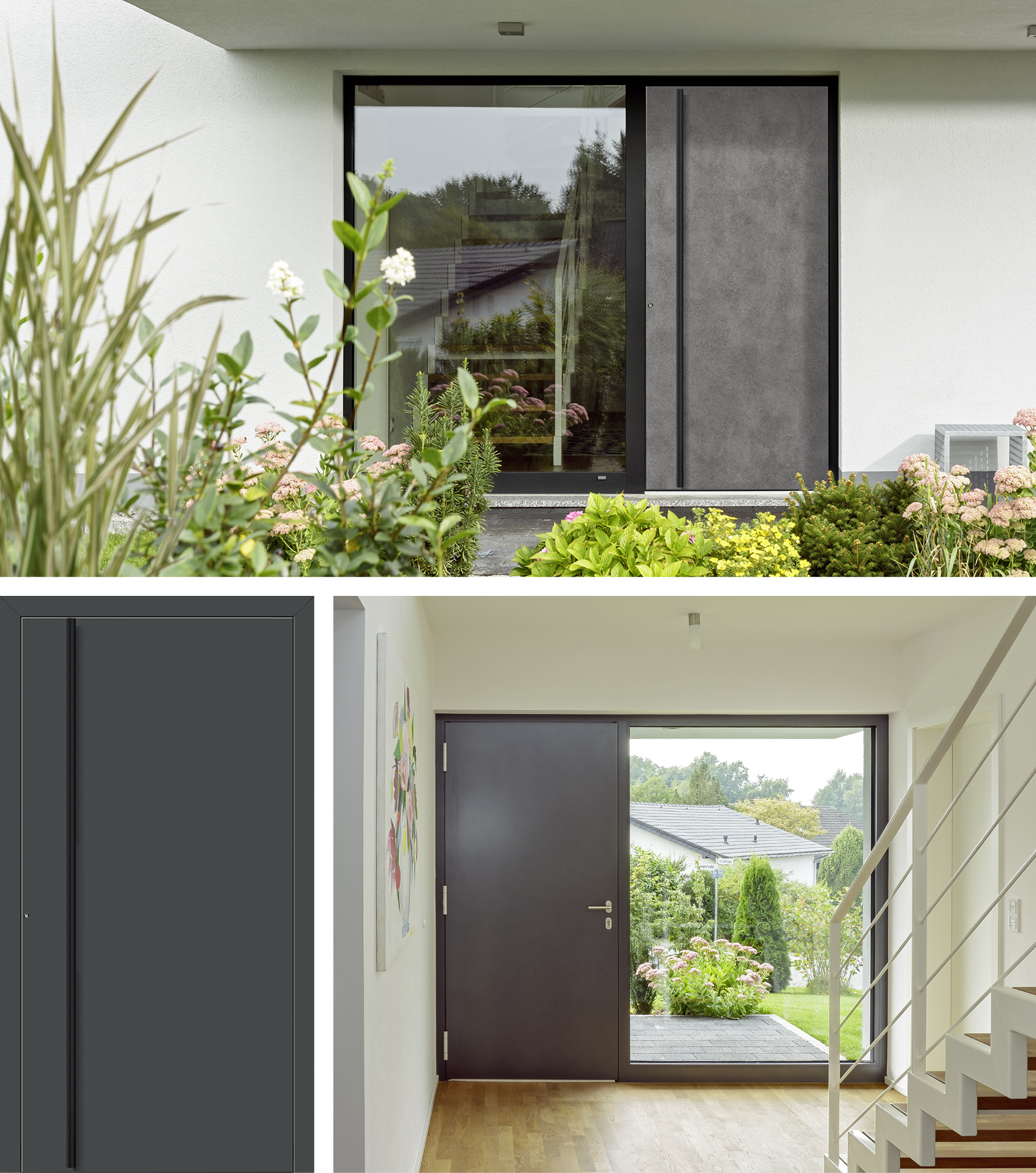 Schwarz als Gestaltungselement ist in der Möbelbranche schon länger im Trend. Aber auch Haustüren gibt die Farbe Schwarz einen neu entdeckten, ganz besonderen Eindruck. Sicher, eine weiße Tür passt zu fast allen Häusern, doch dunkle Töne verleihen mehr Tiefe und neue Gestaltungsmöglichkeiten. Wer es Ton in Ton mag, kombiniert zu den schwarzen Griffen und Applikationen auch den Briefkasten, die Hausnummer oder die Lampen in Schwarz. Und sogar die komplette Tür ist in Schwarz ein echter Hingucker. Haben Sie es gern modern, wählen Sie eine zeitlose Grundfarbe oder eine der trendigen  Designfolien in Rost- oder Betonoptik. Jedes einzelne Türmodell lässt sich so in reichlichen Kombinationsmöglichkeiten individuell gestalten und gibt Ihrem Haus seinen eigenen Charme.
