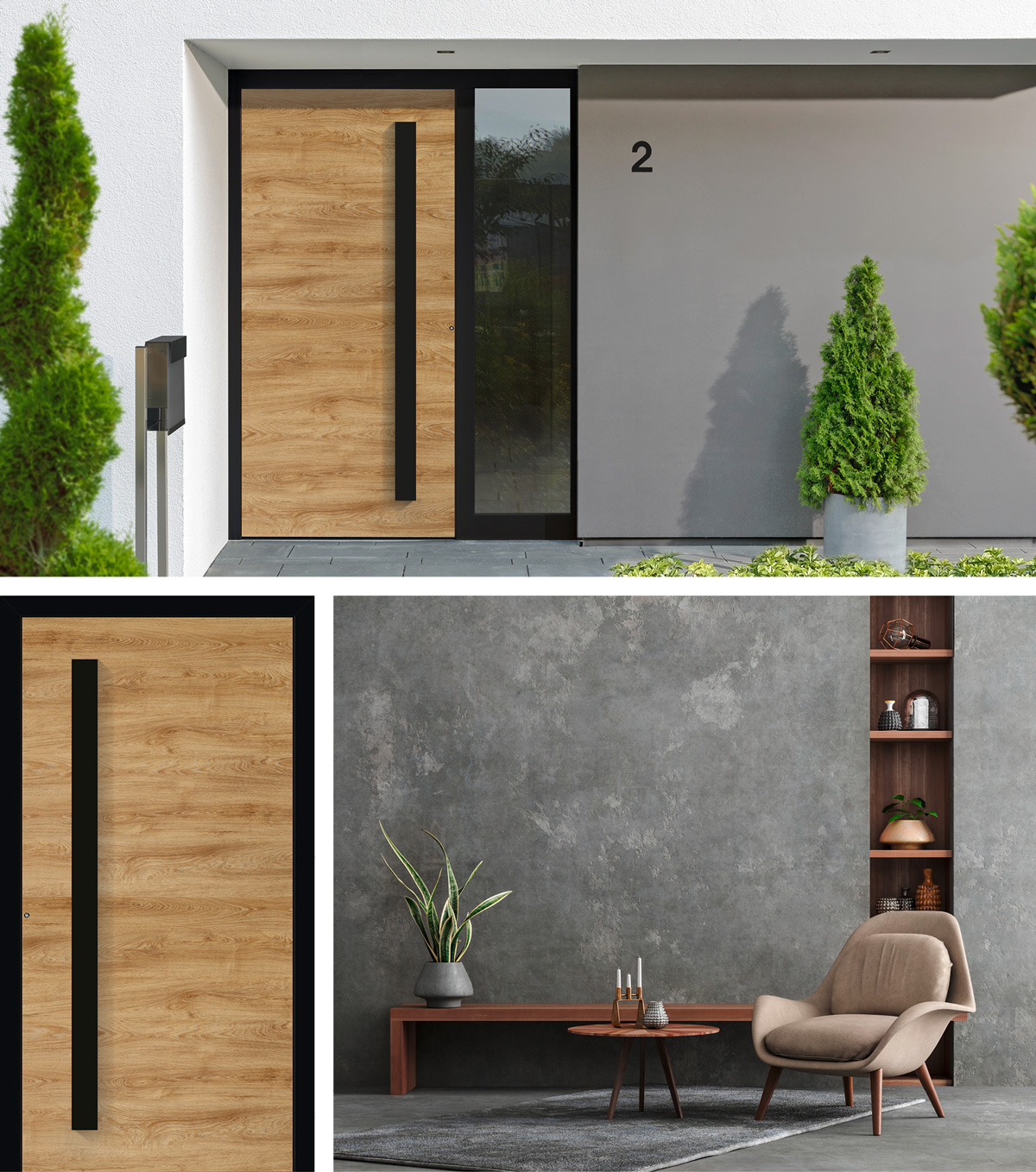 Mögen Sie es gemütlich? Dann kombinieren Sie schwarze Details mit einem natürlichen Holzdekor. Die adeco Designfolien ähneln echtem Holz in Optik und Haptik hervorragend, und verleihen dem Hauseingang einen einladenden Eindruck. Wählen Sie aus fünf wohnlichen Holzfarbtönen – malt, nature, concrete, alpin und amber. Bei den Modellen Metris verglast, Metris geschlossen, Alliso und Caverro ist es möglich, Längs- und Querfolierung zu kombinieren (adeco Designfolierung AD). Hier folgt die Maserung dem Design der Tür, beispielsweise den waagerechten Intarsien.