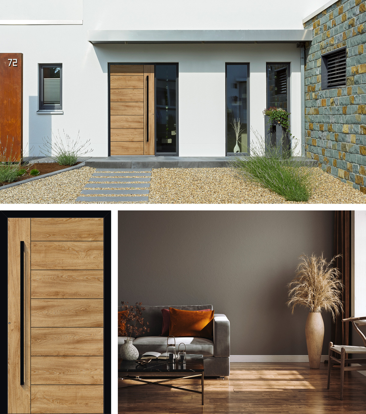 Mögen Sie es gemütlich? Dann kombinieren Sie schwarze Details mit einem natürlichen Holzdekor. Die adeco Designfolien ähneln echtem Holz in Optik und Haptik hervorragend, und verleihen dem Hauseingang einen einladenden Eindruck. Wählen Sie aus fünf wohnlichen Holzfarbtönen – malt, nature, concrete, alpin und amber. Bei den Modellen Metris verglast, Metris geschlossen, Alliso und Caverro ist es möglich, Längs- und Querfolierung zu kombinieren (adeco Designfolierung AD). Hier folgt die Maserung dem Design der Tür, beispielsweise den waagerechten Intarsien.
