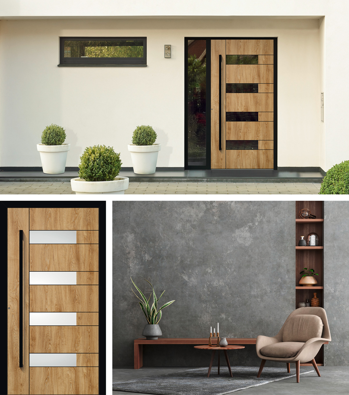 Mögen Sie es gemütlich? Dann kombinieren Sie schwarze Details mit einem natürlichen Holzdekor. Die adeco Designfolien ähneln echtem Holz in Optik und Haptik hervorragend, und verleihen dem Hauseingang einen einladenden Eindruck. Wählen Sie aus vier wohnlichen Holzfarbtönen – malt, nature, concrete und alpin.