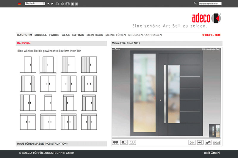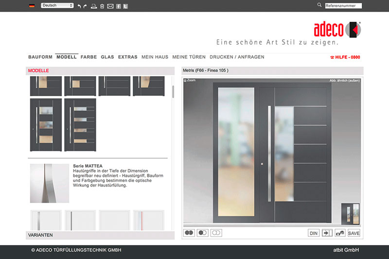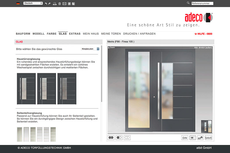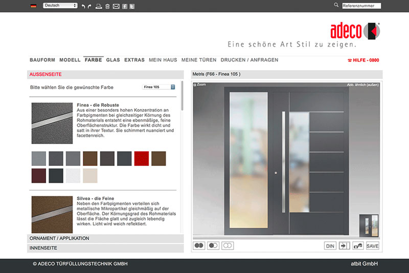 Уже испытанный на практике интерактивный конфигуратор для входной двери позволяет наглядно демонстрировать разнообразные и индивидуальные решения дверного заполнения. В текущем году мы на основании отзывов и советов, полученных от наших партнёров по сбыту, улучшили управление конфигуратором, сделав его ещё более удобным в обращении и лучше отвечающим индивидуальным потребностям. Конфигуратор подразделён на следующие участки: